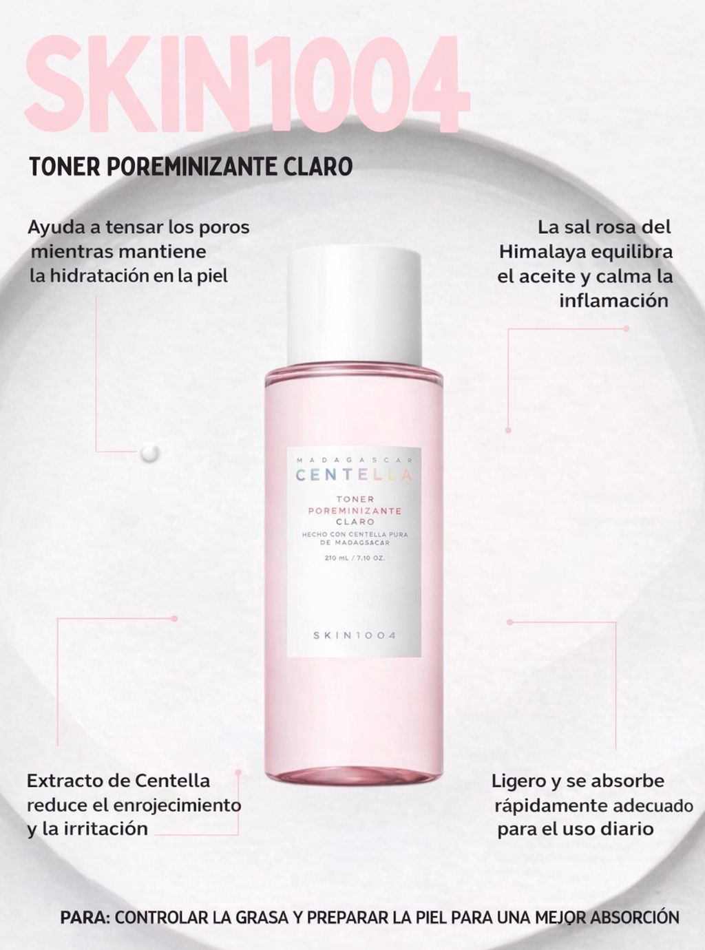 - Tónico facial exfoliante y equilibrante formulado con Centella Asiática y activos que ayudan a mejorar la apariencia de los poros y controlar el exceso de sebo. Su textura ligera refresca la piel sin resecarla, dejándola más limpia y uniforme.
