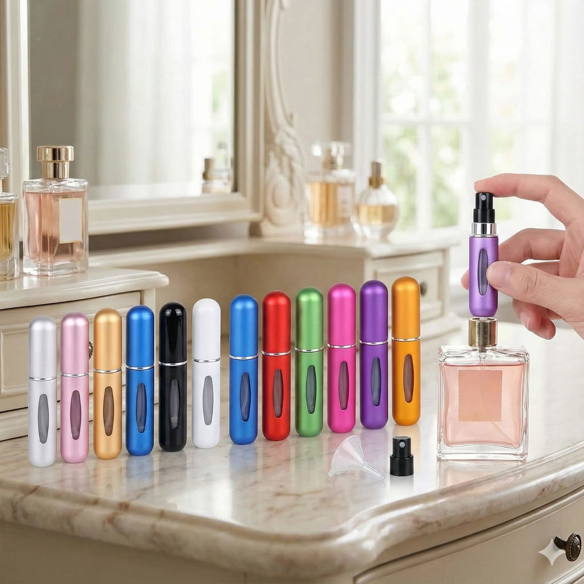 - Atomizadores portátiles recargables, ideales para llevar tu fragancia favorita a todos lados de forma práctica y segura. Su diseño compacto y elegante los convierte en el complemento perfecto para cartera, bolso o neceser.