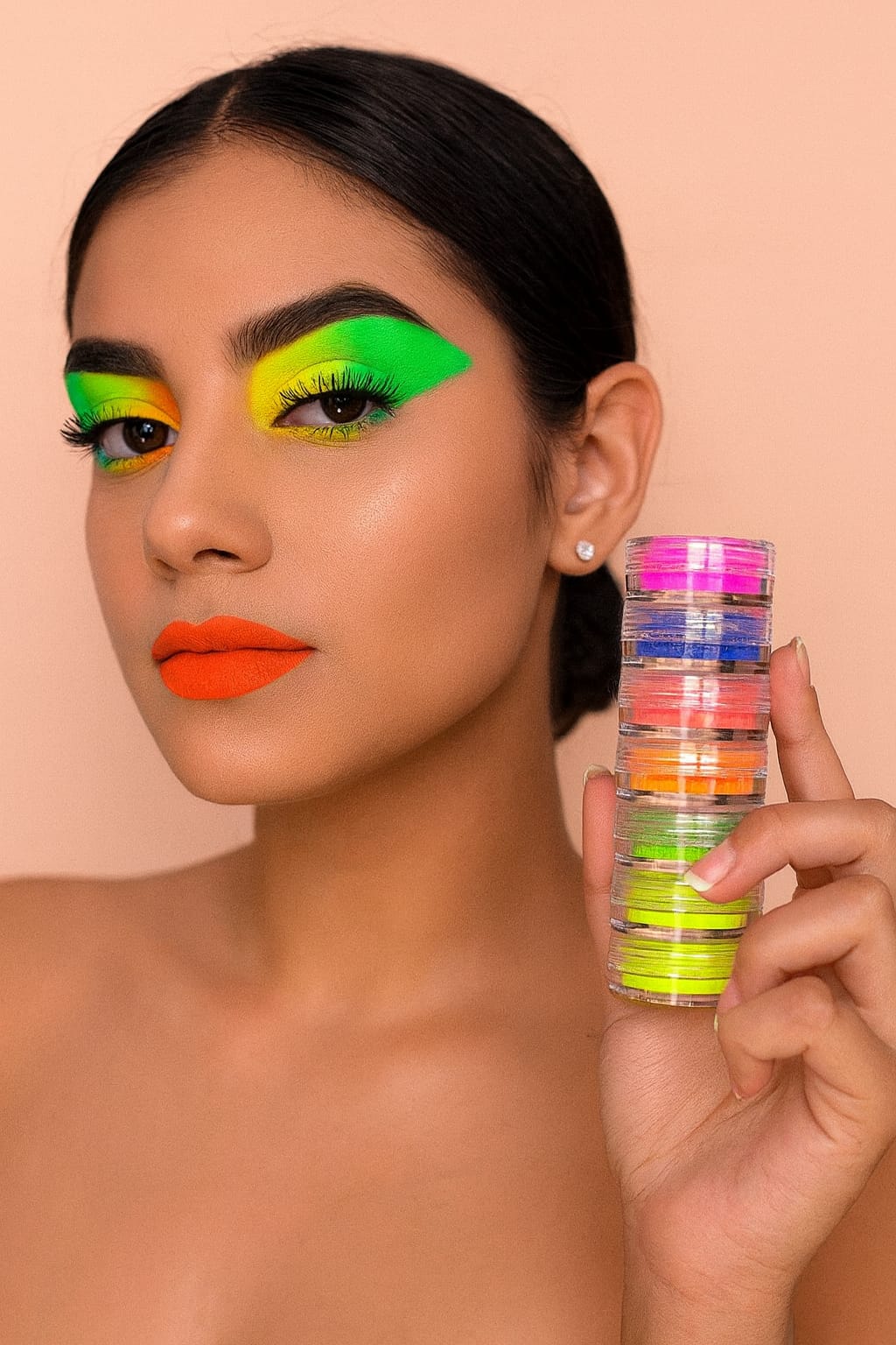 - Set de pigmentos neón en torre con 6 colores vibrantes, ideal para crear maquillajes llamativos y creativos. Sus tonos intensos permiten resaltar ojos, labios, cuerpo o uñas, logrando un acabado impactante y lleno de color.