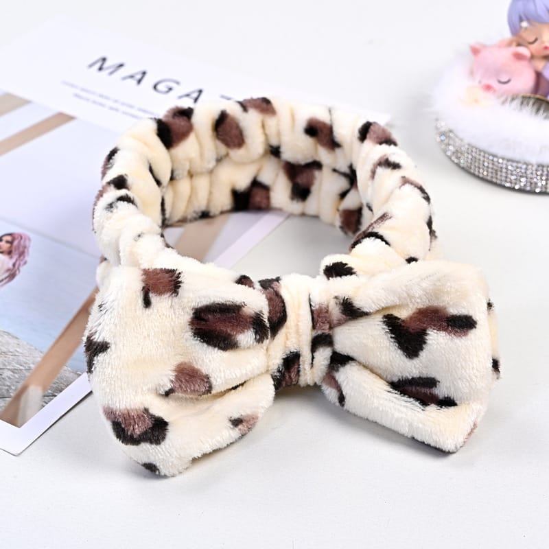 - Vincha de tela suave con diseño de moño y estampado de lunares, ideal para sujetar el cabello durante la rutina de skincare, maquillaje o limpieza facial.